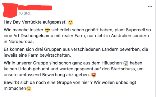 Es existiert aktuell ein Facebookpost auf der Hay Day Fanseite: Hay Day Deutschland IOS Android in dem geschrieben wird: