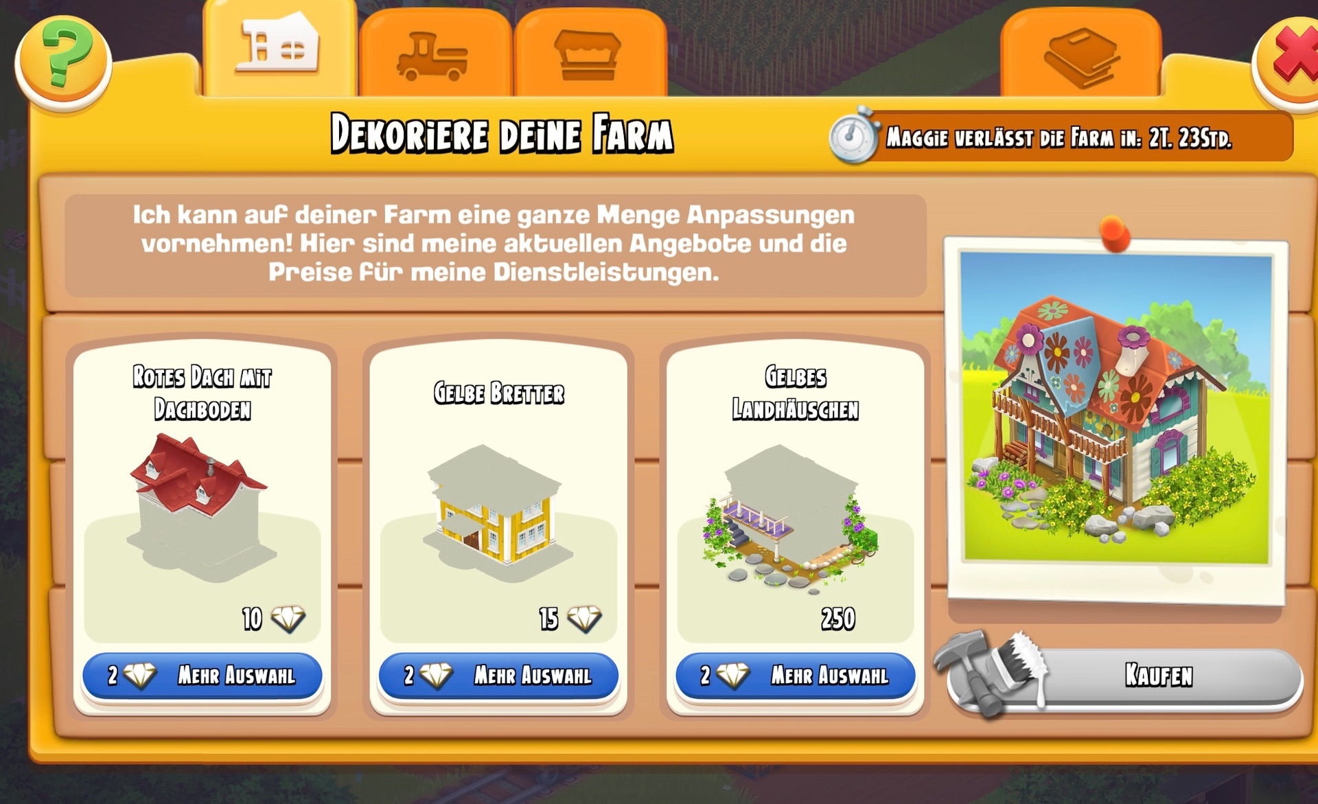 Mein heutiges Angebot bei Maggie beinhaltet ein „gelbes Landhäuschen“ um 250 - ja was? Münzen, Diamanten, Gutscheine ?