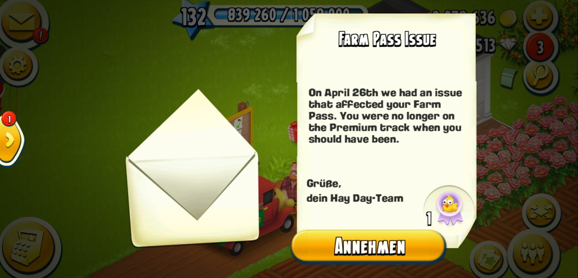 Den dritten Besuch von Alfred konnte ich leider nicht festhalten - da waren die 600 Kükenschritte drin, die mich zum Aufleveln und zu einer Ackerfläche plus 12 Diamanten brachte.