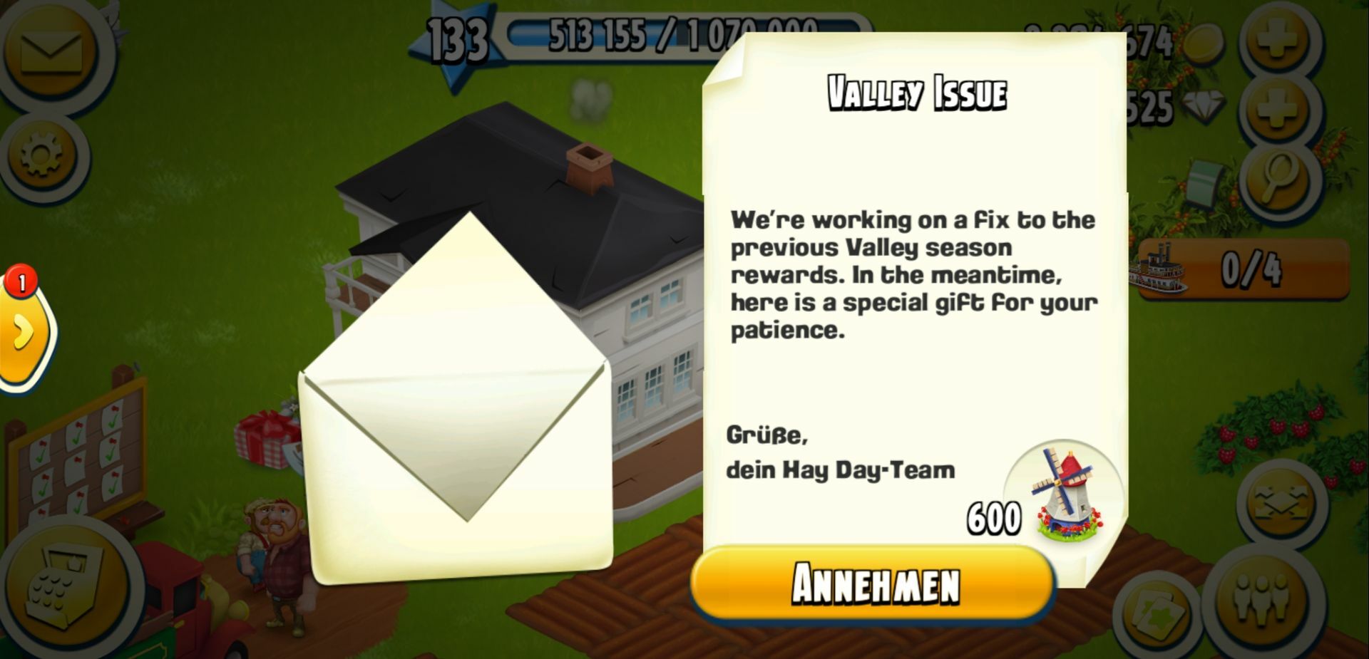 Beim Blick aufs frisch beendete Tal hab ich mich immens geärgert, denn von den ca 1400 blauen, 1500 roten und genau 1114 grünen Token war nix mehr da. Mein Plan, die Windmühle plus 10 Diamanten abzuholen, war nicht umsetzbar. Ein nächster Blick auf das Ausrufezeichen über dem Farmpass zeigte mir das nächste Debakel: soeben habe ich die ersten 5 Punkte für eine Aufgabe erhalten - - - - es fehlten also nur 595 Punkte, wohin auch immer die verschwunden sind.
