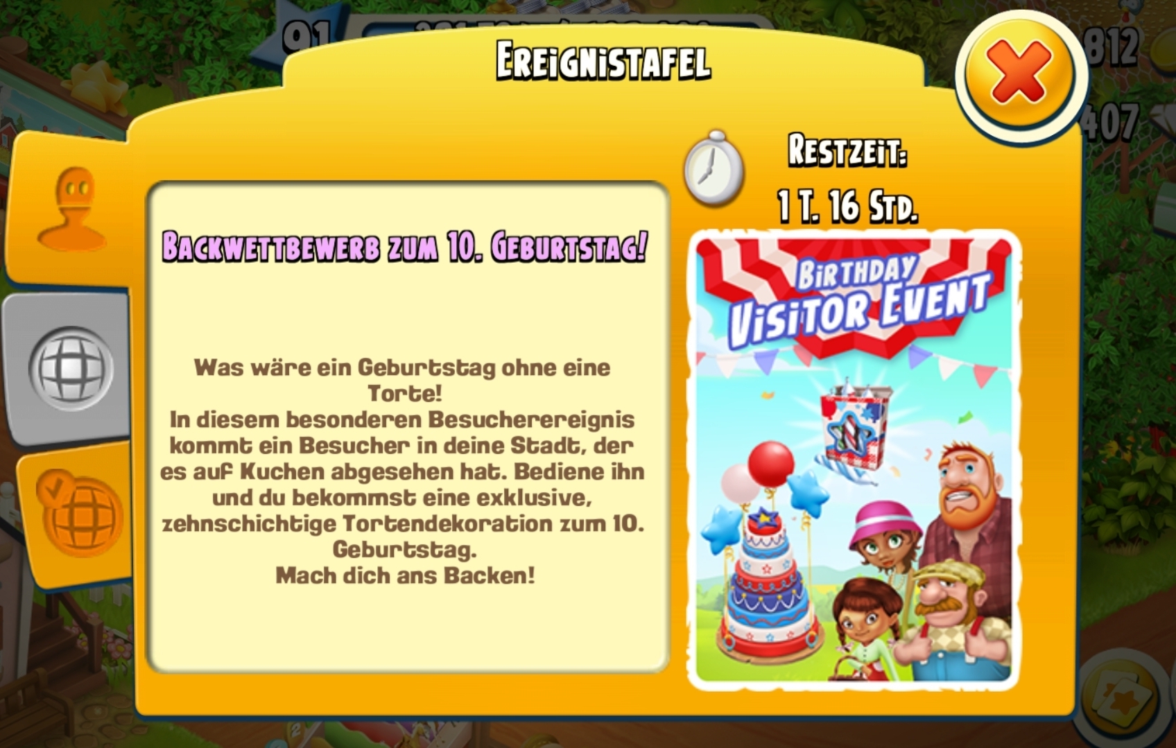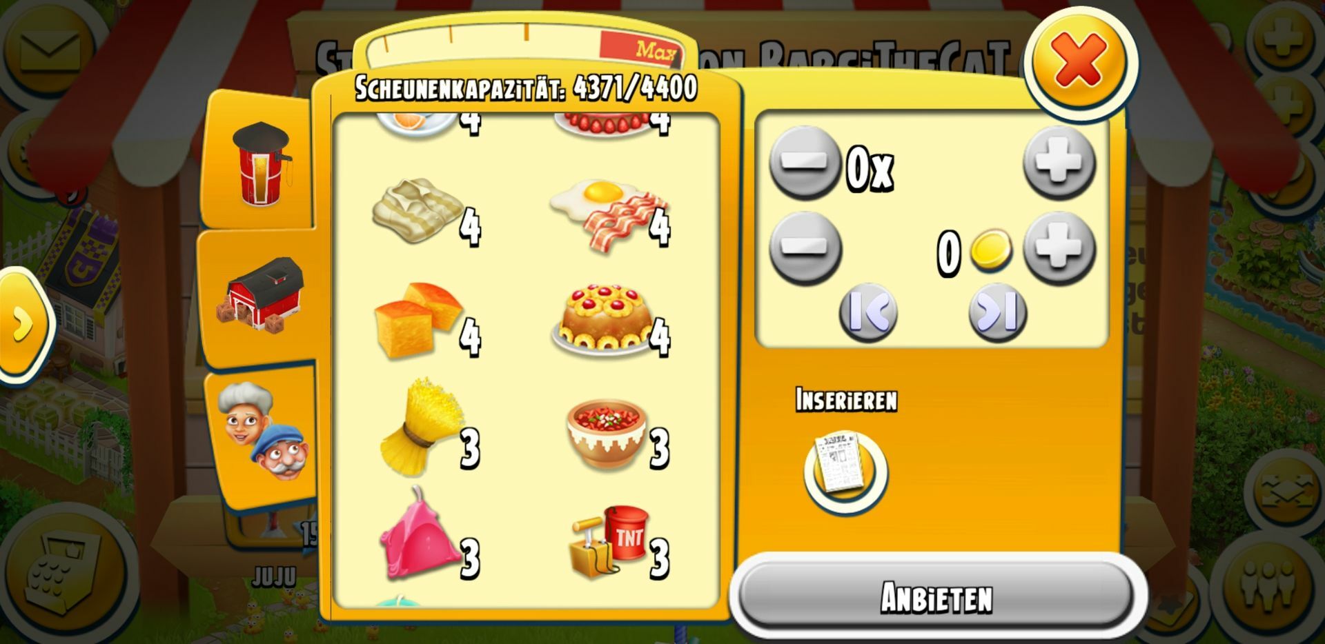 Kein Stadt-Besucher, sondern ein Farmbesucher wird Dir das anbieten. Bei Deinem Level werden 4 Ananaskuchen verlangt. Wenn Du den betreffenden Besucher aus Versehen weg schickst, kommt kein neuer, also Vorsicht!