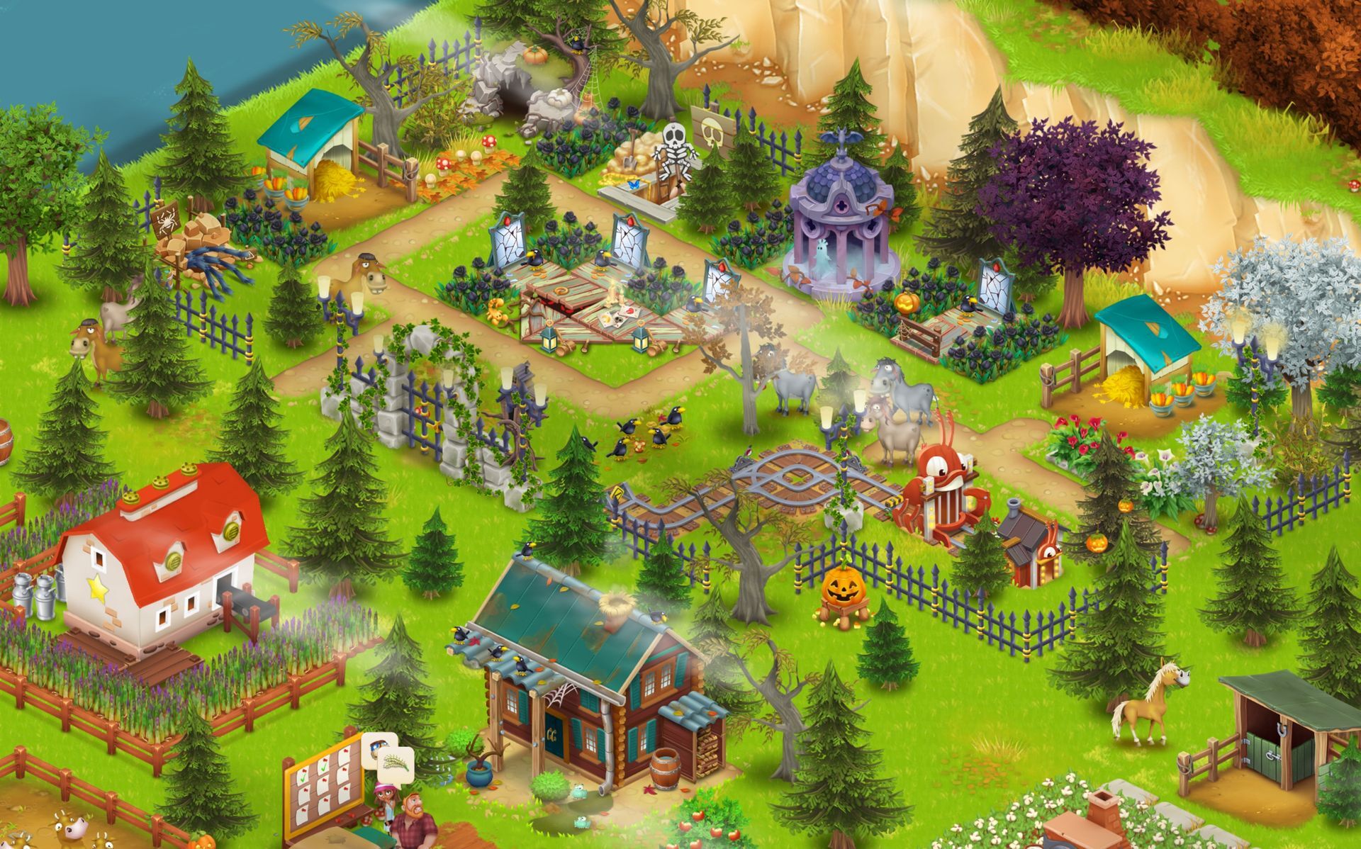 Da ich aber momentan in Deko-Laune bin, habe ich gestern bei der größten Babyfarm Halloween etwas aufgehübscht (auch etwas größer gemacht), und habe mich dabei von Gregs Farm inspirieren lassen. Nein, nicht vom vorderen Teil, der ist überfrachtet. Aber hinten rechts ist es schön geworden. Spooky, aber irgendwie auch entspannend. Das habe ich zum Teil übernommen. Die kleinste Farm hat auch ein Update bekommen, ich habe den Bereich ebenfalls vergrößert und die beiden Eselställe reingestellt. Sieht knuffig aus, wenn sie zwischen den gruseligen Sachen hin- und her spazieren. Das einzige, was mir hier fehlt, sind die teuren Bäume. Wenn die verdorrt sind, gibt das ein besonders schönes Bild. Aber bei erst Lv 62 habe ich halt noch nicht Zugriff auf alle Obstbäume. Doch es geht auch so.