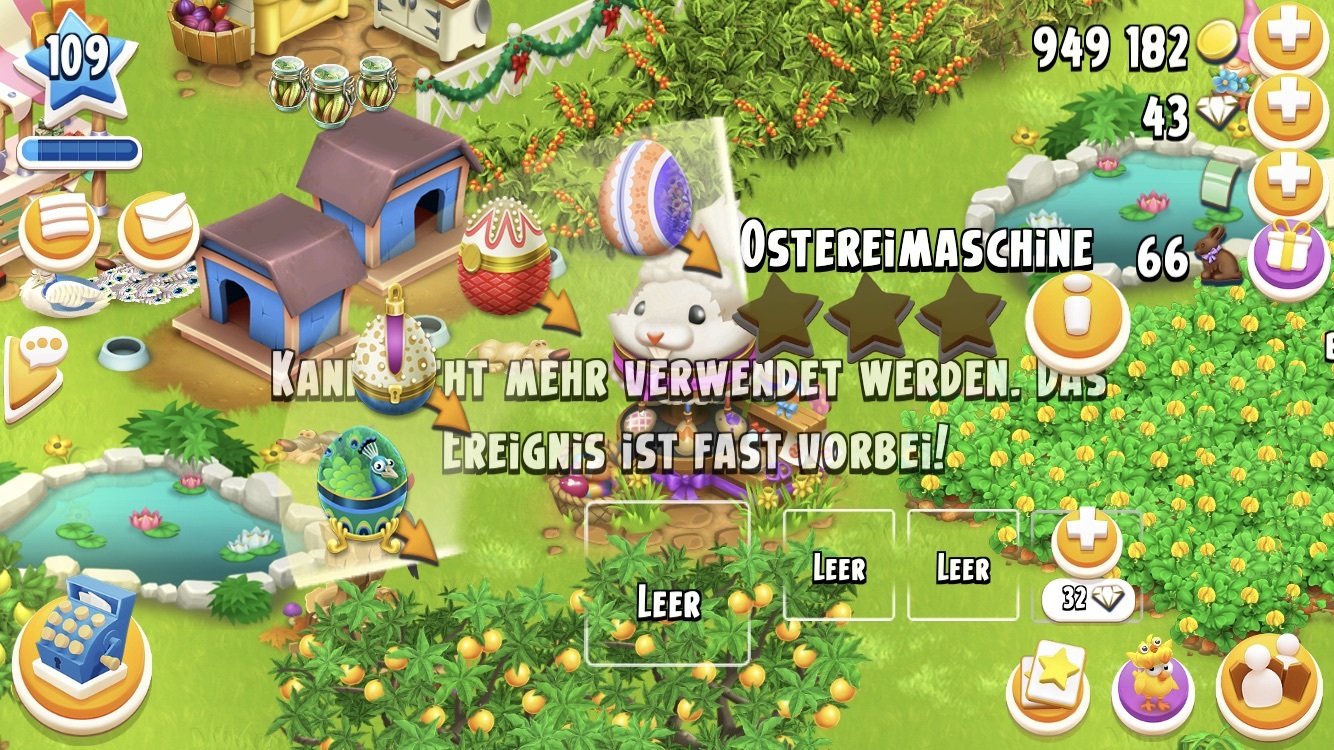 Heute sind plötzlich wieder neue Angebote im Katalog freigeschalten, es können aber keine Eier mehr produziert werden. Wenn das im Vorhinein schon beabsichtigt war, ist das eher ein für-dumm-verkaufen der Spieler! 😡