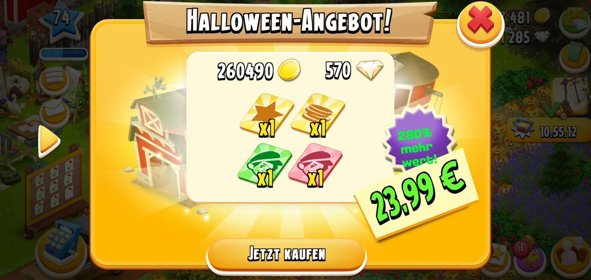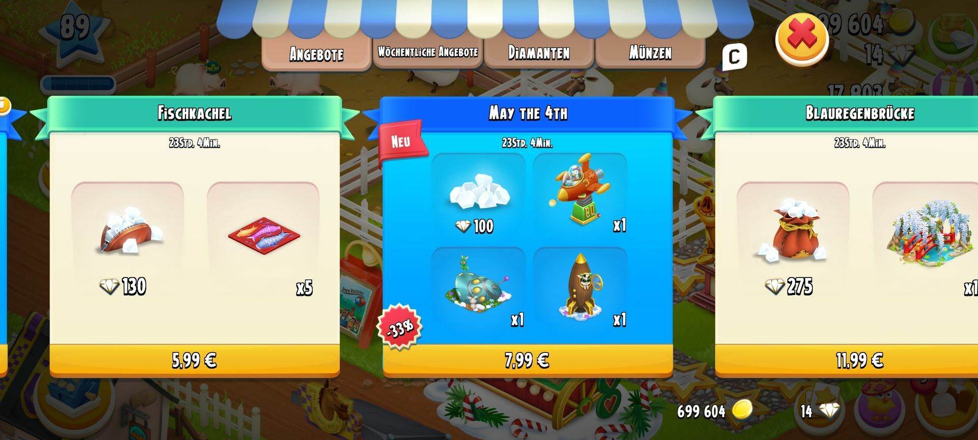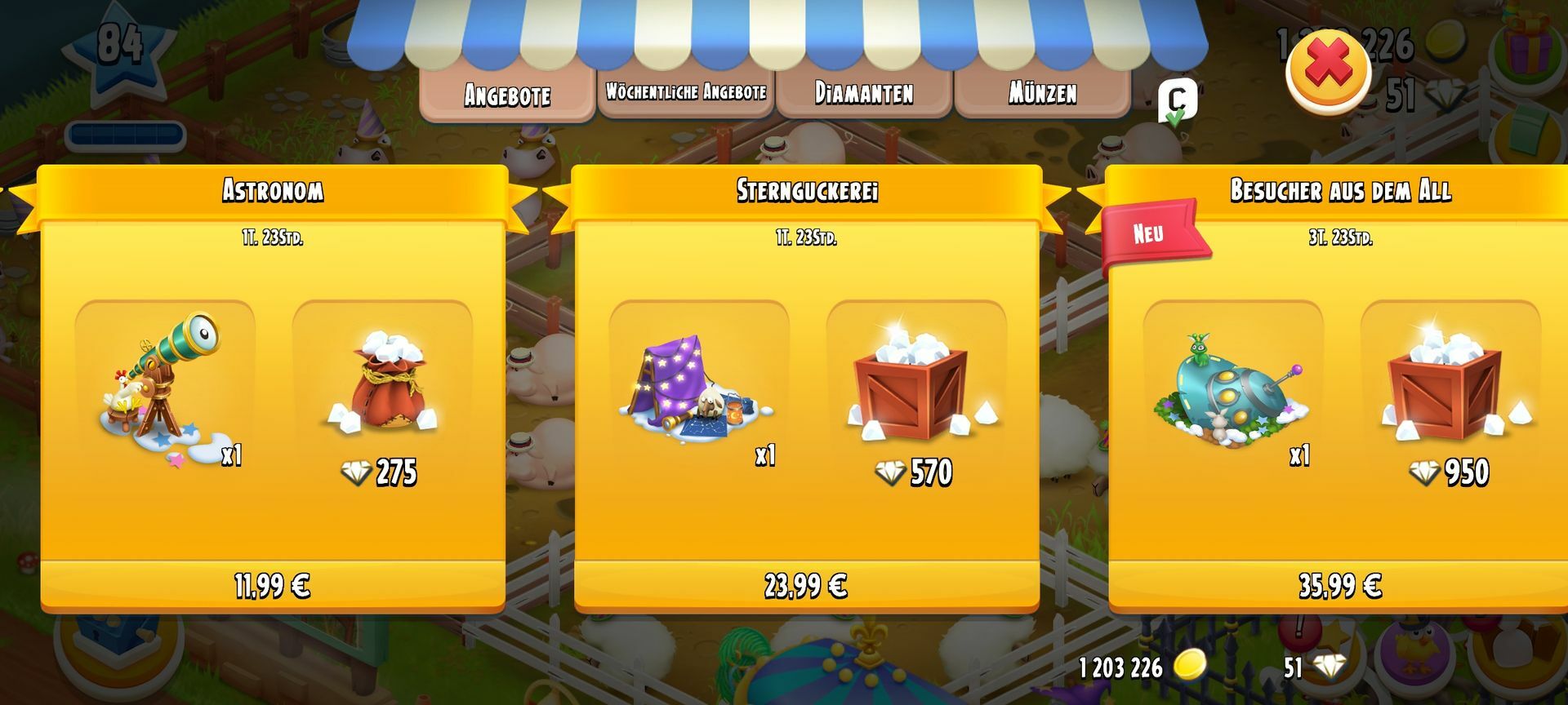 Würde sich lohnen 5€ für die Dias und d die restlichen 3€ für die Deko das Ufo gab's ja letztes Jahr als teuerstes Angebot was Diamanten Deko betrifft 950 Dias für 36€ und das Ufo ich hatte es mir wohl mit Alten Kopf gekauft mittlerweile Kauf ich nur noch Gefühl den FP und meine Ausgabe haben sich Richtung Hay Day reduziert was nicht heißt ich mag es nicht mehr ich seh bloß nicht mehr ein so ne Menge Geld dafür ausgeben
