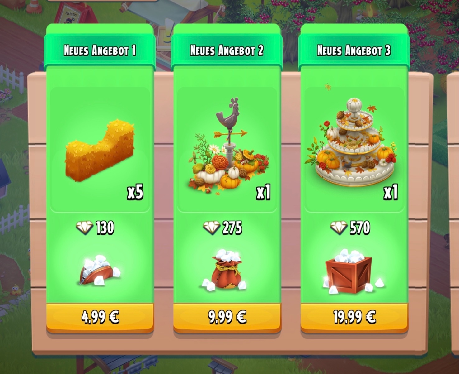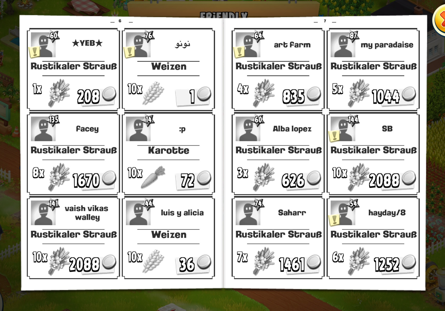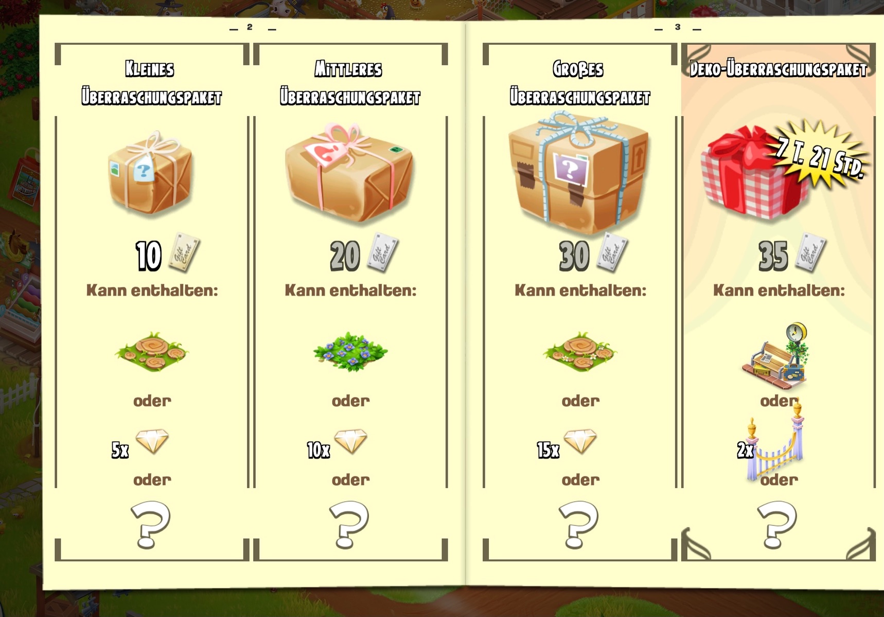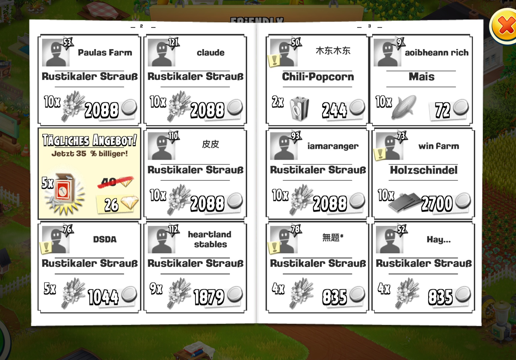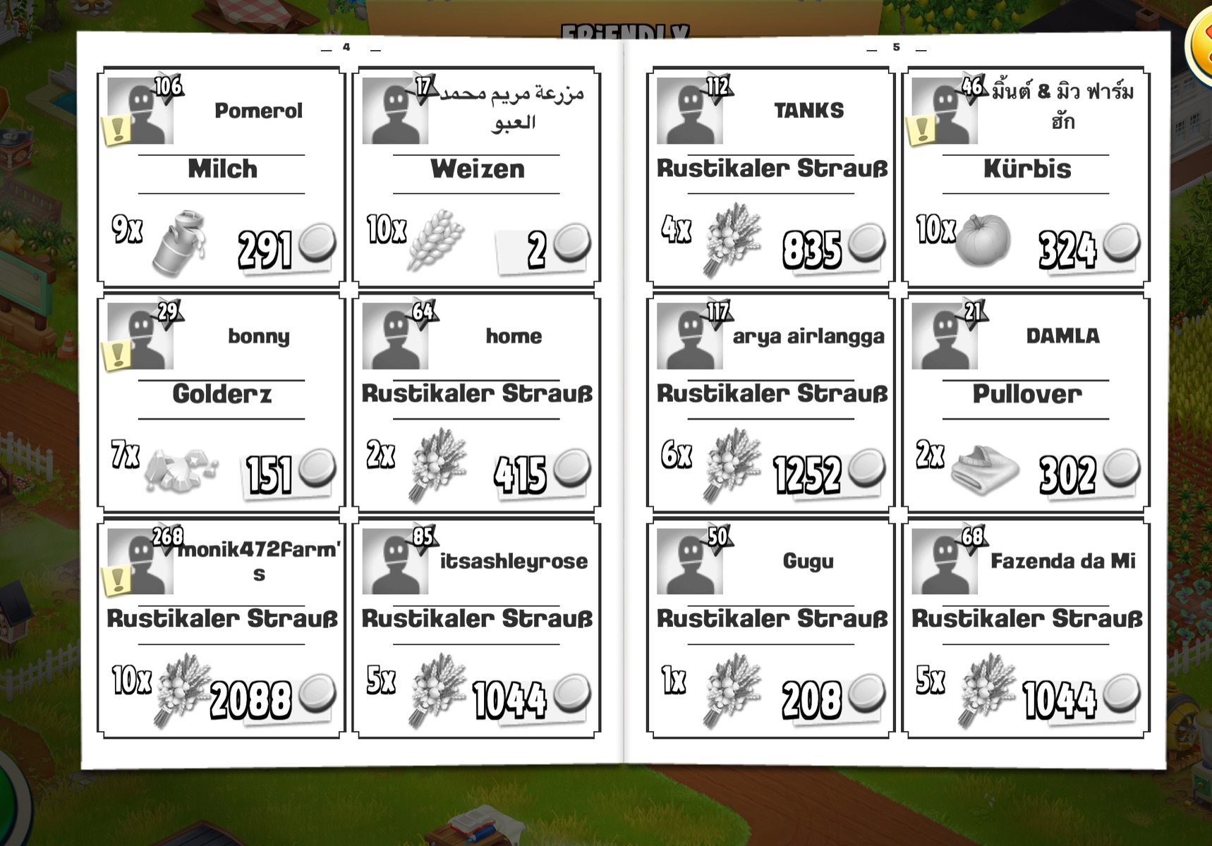 Ja, das wäre auch eine gute Idee über die Dankeskarten. Ich helfe jeden Tag an die 100 Farmen, und nur 7Karten pro Tag ist da auch schmal bemessen. In den Paketen ist fast immer das gleiche drin. Hatte jetzt mal ein Angebot mit einer Bank. Ich hätte am liebsten auch den Wetterhahn geholt, konnte mich nicht diesmal dazu hinreißen lassen echtes Geld auszugeben. Aber kommt vielleicht nochmal. Jetzt gibt es ja wieder die kleine Hexe ![]()