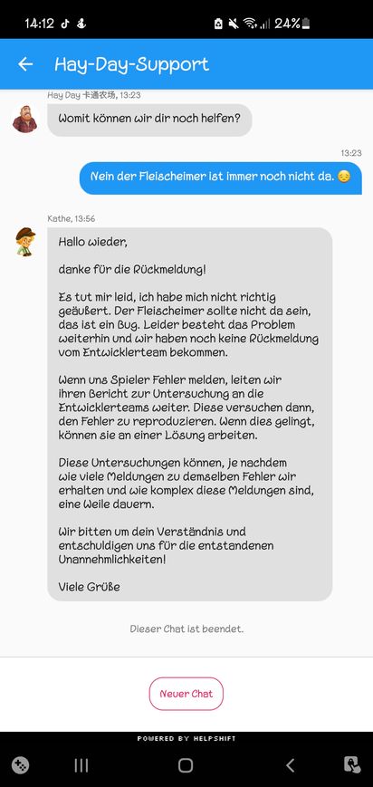 Also ich hatte ja gestern geschrieben, das in der Futtermühle der Fleischeimer fehlt, hatte gestern Abend den Support geschrieben, und siehe da mir wurde geschrieben das es ein Bug ist und es keinen Fleischeimer gibt. ![]()
