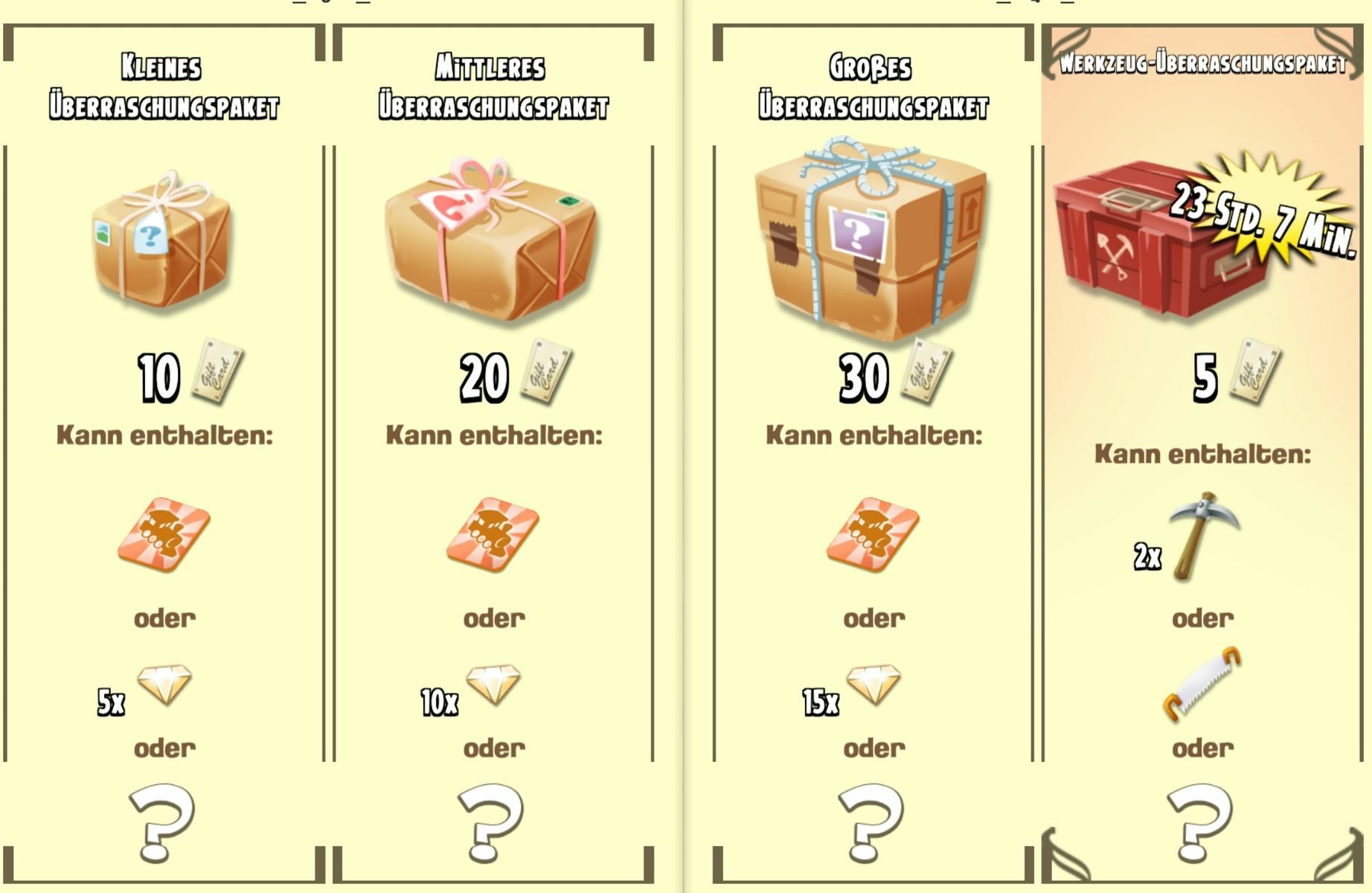 Bin echt sauer und enttäuscht, dass man als „Belohnung“ für das Sammeln der Dankesbriefe oder wenn man mal den Tom kauft, immer nur diese lächerlichen Holzhämmer bekommt! Diese Dinger brauche ich gar nicht, man wird aber, auch im „Glücksrad“ damit zugeschüttet! Frage mich, was das soll? Warum nicht Bretter oder Bolzen, Puzzleteile was man viel dringender braucht?