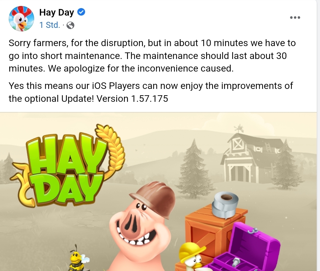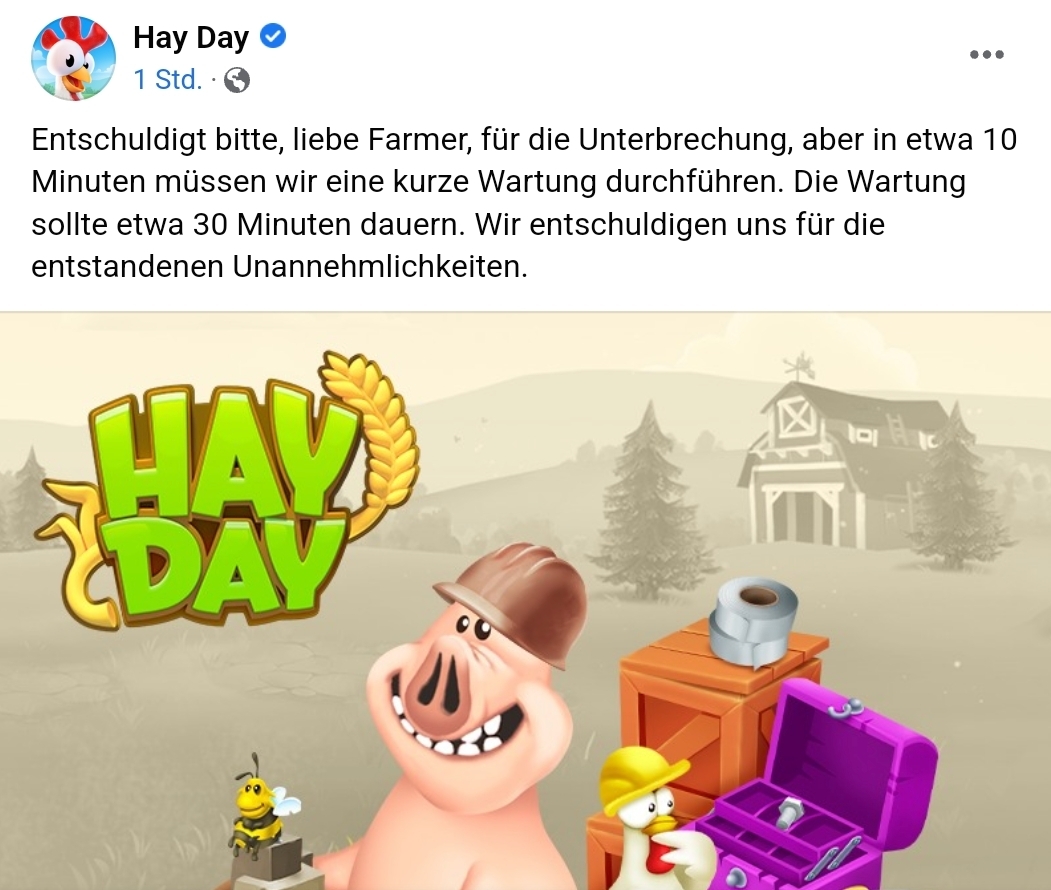 Im Posteingang bei Hayday steht immernoch die Info vom letzten Update. Ich verstehe wirklich nicht was so schwer daran ist, bei dem Text einfach mit einzufügen, welche Probleme aufgetreten sind und woran noch gearbeitet wird.