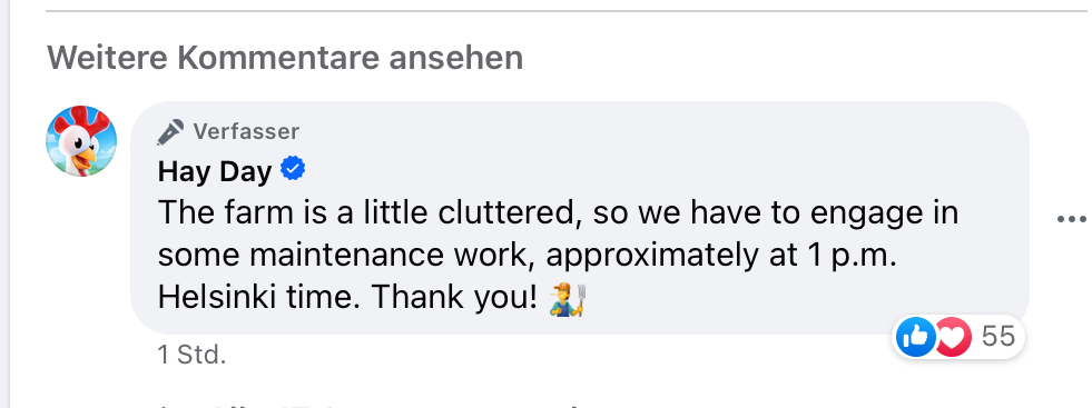 Auf FB kündigt HayDay für heute 1300 Helsinki-Zeit, also 1200 unsere Zeit, eine Wartung unbekannter Dauer an.