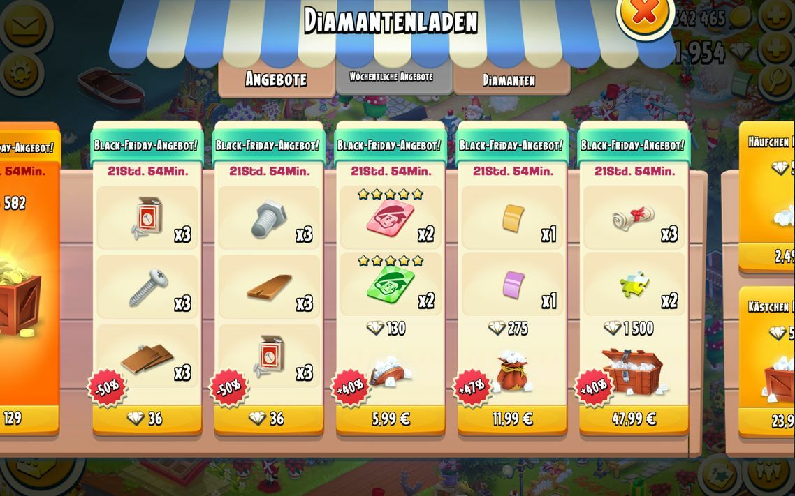 Versteht jemand die Black-Friday-Angebote, z.B. das ganz rechts 3xRöllchen, 2xPuzzle, 1.500 Diamanten. Bei den Diamanten steht +40%, angegeben sind aber 1.500, und der normale Preis für 1.500 Diamanten ist derselben wie hier im Angebot. Bei 40% mehr müssten es ja 2.100 Diamanten sein. Ich verstehe dieses Angebot nicht. Bei dem ganz links ist es richtig, normal kosten 570 Diamanten 23,99 Euro, bei den 20% mehr sind es 685.