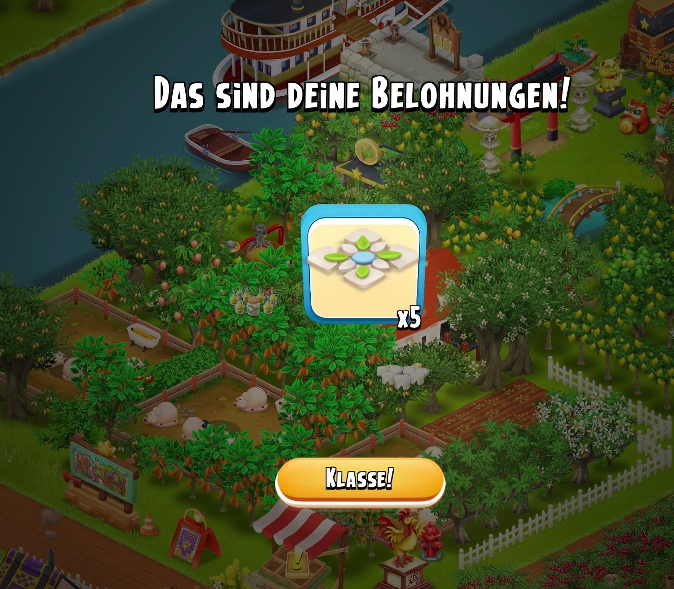 hab jetzt meine farm verhunzt und alles was ging am waldrand mit fässern und den in unmengen erhaltenen pflanzbänken zugestellt. aber siehe da — herr und frau fuchs interessieren auch diese hindernisse nicht. hab heute schon wieder 2 zwischen meinen bäumen (nebst den 4 in den noch nicht freigeschalteten feldern.