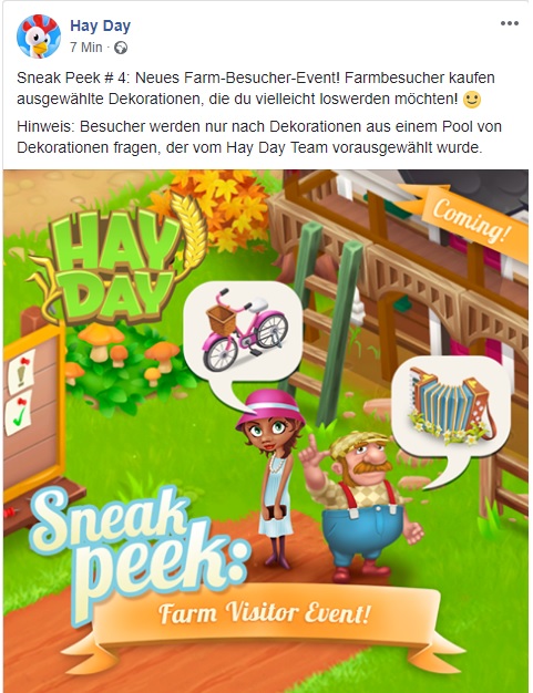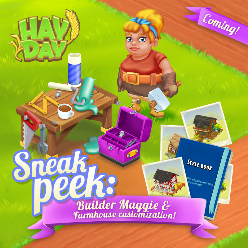 Wir freuen uns sehr darauf, dem Spiel einen neuen Charakter zu verleihen - Sag Hallo an den Baumeister "Maggie", der einmal in der Woche deinen Bauernhof besuchen wird, um dein Bauernhaus neu zu dekorieren! Das einzige Kriterium, um Maggie dazu zu bringen, deine Farm zu besuchen, ist, dass du Level 31 bist und mindestens 20 Erfolge erreicht hast!