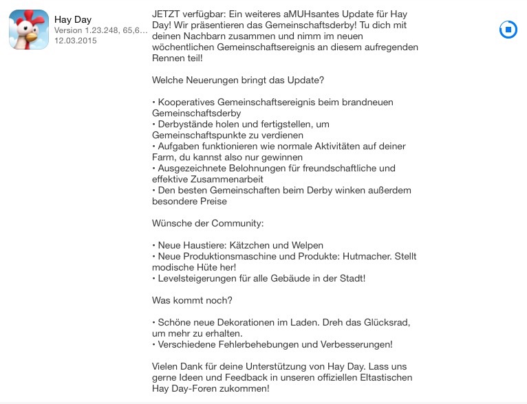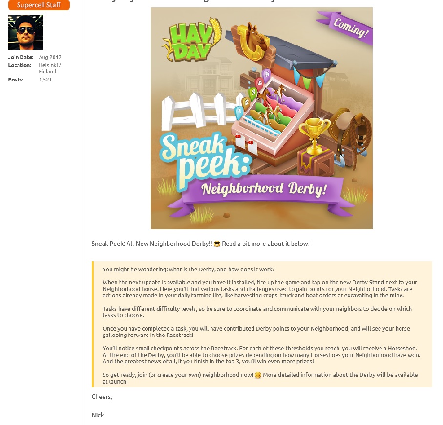 @Mira auf den Geräten wo Android läuft ist im Playstore ein Foto aufgetaucht wo mit den Pferden von Hayday ein rennen gemacht wird.... es scheint auch ein neues Foto zu sein da auf diesen Bildern die katzenbabys und auch die hundewelpen spielend zu sehen sind... wenn du dir dieses bild gerne ansehen möchtest musst du mal auf seite 11 oder auch seite 10 zurück blättern dort haben schon einige das bild rein gestellt....