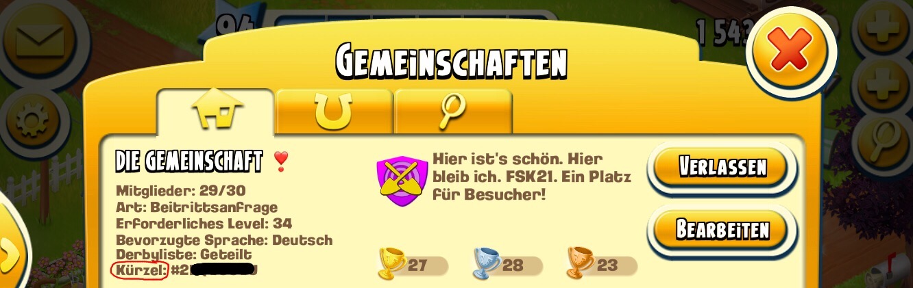 Das Kürzel deiner Gemeinschaft findest du, wenn du auf dein Gemeinschaftshaus klickst: