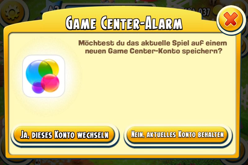 -android gekauftjetzt hatte ich die idee mich bei dem iphone meiner freundin mit meiner gamecenter id anzumelden, meine farm öffnen, dann bei facebook registrieren und farm dort speichern. Dann könnte ich auf dem android facebook öffnen und den spielstand aus Facebook übernehmen..wenn ich jedoch die gamecenter id eingebe und dann hayday auf dem iphone meiner freundin öffne dann kommt die meldung die ich per bild angefügt habe! Was mach ich falsch? Was muss ich tun damit alles so funktioniert wie ich mir das vorstelle :)?