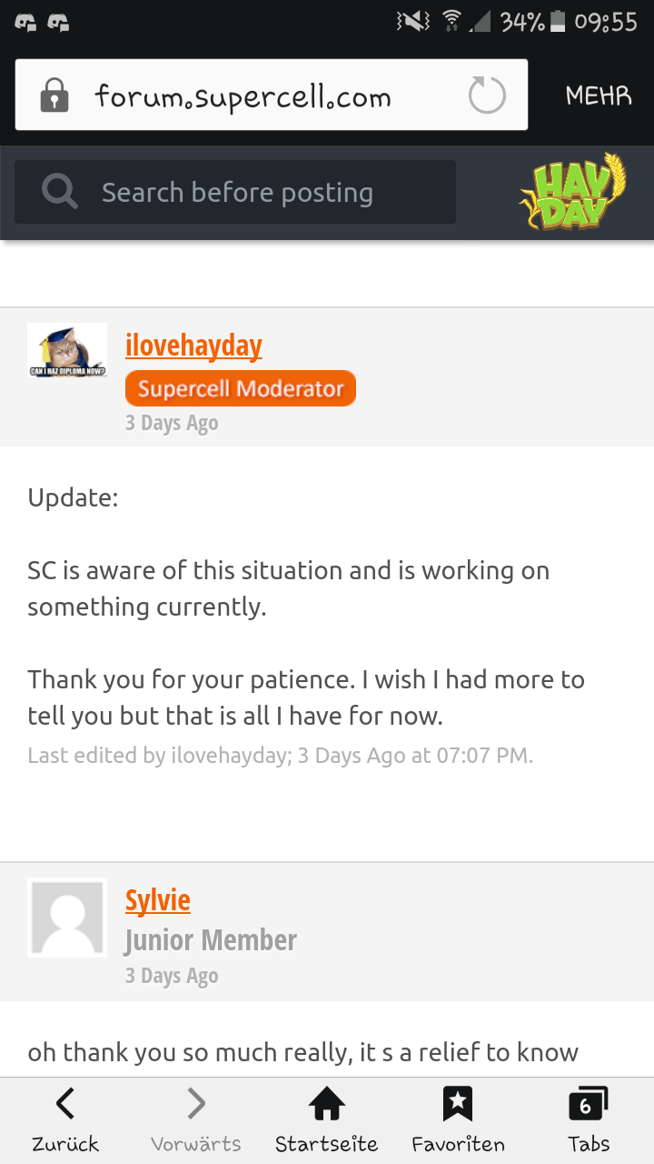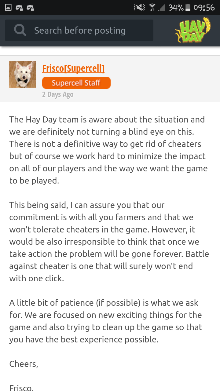 "Dem Hay Day Team ist das Problem bewusst und wir werden es nicht unberücksichtigt lassen. Es gibt keinen tatsächlichen Weg, dass Problem von Betrügern zu beseitigen, aber wir arbeiten hart daran das Ausmaß zu verkleinern für unsere Spieler die das Spiel so spielen wie es gewünscht ist. "
